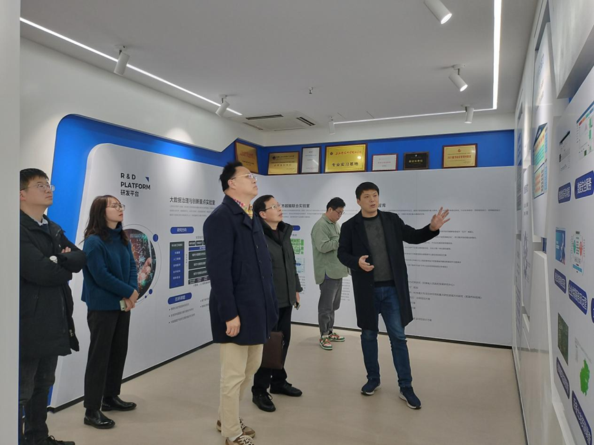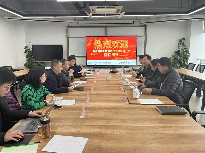 與會人員首先參觀了研究院展廳,上海蜂威科技發展有限公司總經理水新瑩介紹了研究院與上海蜂威的發展歷程、人員架構、科研技術以及榮譽。     在隨后交流當中,浙江智咖互聯網科技有限公司CEO駱江建講述了浙江智咖發展歷程、主要產品和未來戰略規劃,希望與上海蜂威以及研究院合作,打通從科研到成果轉化的痛點堵點,筑牢“產學研”通融的戰略合作關系。長三角信息智能創新研究院常務副院長承孝敏提到“科技創新必須本著為民、惠民、利民的宗旨,堅定不移地跟著黨走,試點先行,探索形成‘基層智治’創新實踐典范”。